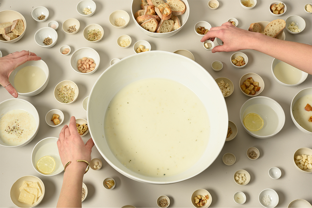 Sans Cuillère was created as part of the collaborative exhibition “Konsistenzen“ at the Culinary Arts Gallery Zagreus in Berlin Mitte. Using our handmade porcelain bowls (4-40cm) and a assortment of ingredients to mix their meal, guests actively create their own rituals. The colors of the bowls and ingredients are intentionally kept to different shades of white in order to not make the visual stimulus exceed the sensual stimulus. By mixing the various ingredients with the warm soup new consistencies are created, oil form eyes on the soups surface, cheese and croutons become soft and spices and salts dissolve completely.